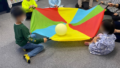 曲に合わせて自由にスカーフを動かします!勿論曲にあった動きをしていないのはただ自分の動きたいように動いている(ゆったりの曲を激しく動くなど)ことになりますので、最低限曲に合わせた動きは大事にします。しかしそれ以外は自由な動きで、お子さんが感じたまま表現することを大事にしています。